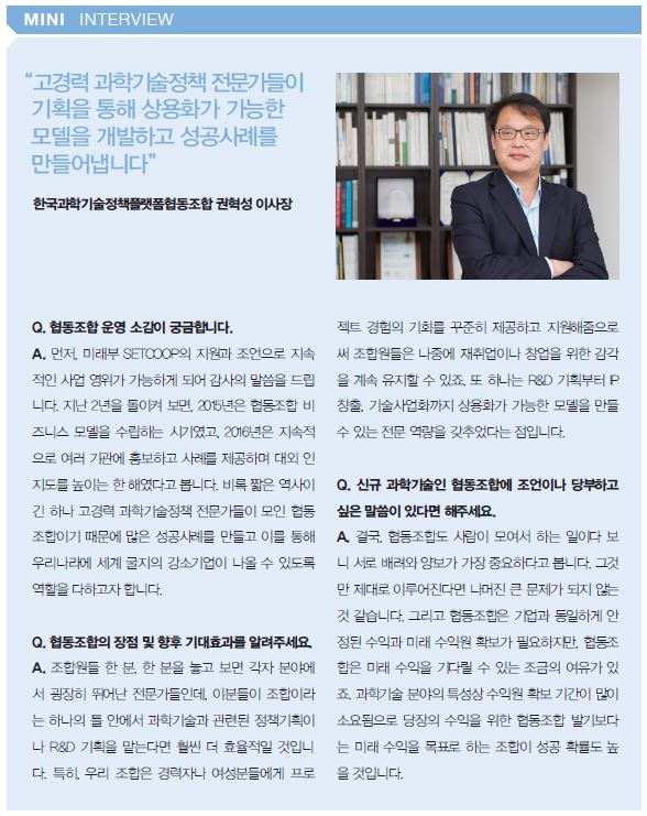 과학기술인협동조합 사례집 관련링크 http://www.setcoop.net/ [관련링크] 페이지 정보 작성일17-01-10 13:02 조회6,012회 본문 미래창조과학부 과학기술인협동조합지원센터(www.setcoop.net)의 협동조합 운영사례 및 보도자료 이전글 다음글 목록