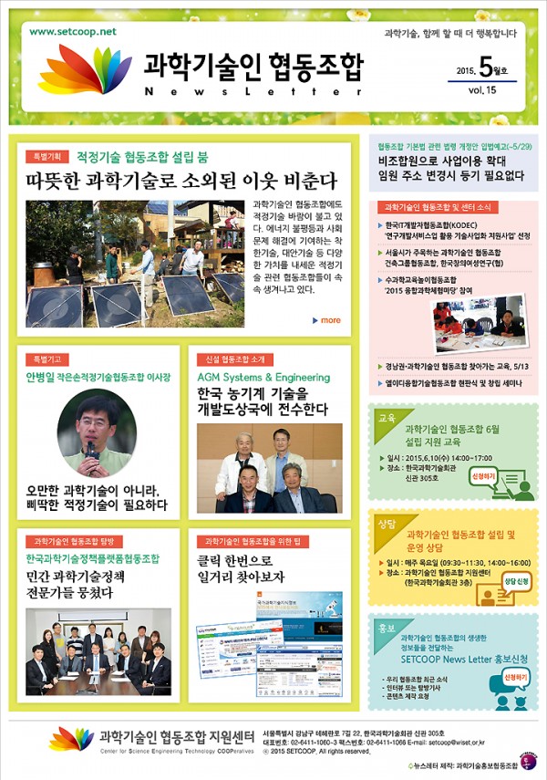 권 이사장은 “특허출원과 기술사업화 업무를 하다보니까 R&D나 정책 방향도 중요한 일이라고 느껴져 뜻을 같이 하는 특허법인의 직원들과 주위 전문가들을 모아 협동조합을 만들게 됐다고 한다. 과학기술인 협동조합 지원센터를 몇 번 찾아가 설립 자문을 받은 후 지난 2월 창립총회를 열었다.
